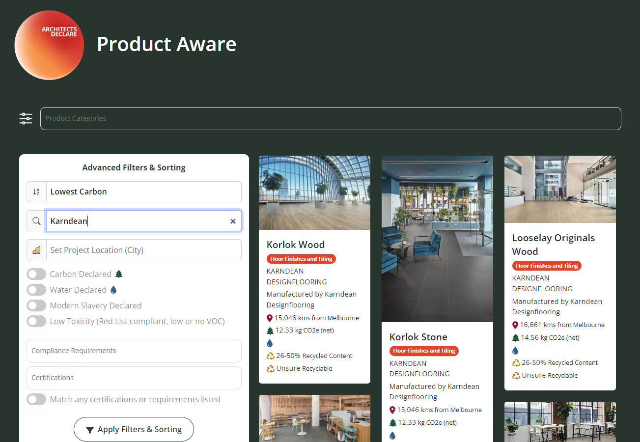 At Karndean, we're proud to support the adoption of Product Aware and encourage our partners to make use of this innovative tool. By integrating Product Aware into your specification process, you can help lead the way in sustainable design and contribute to a more environmentally responsible future.