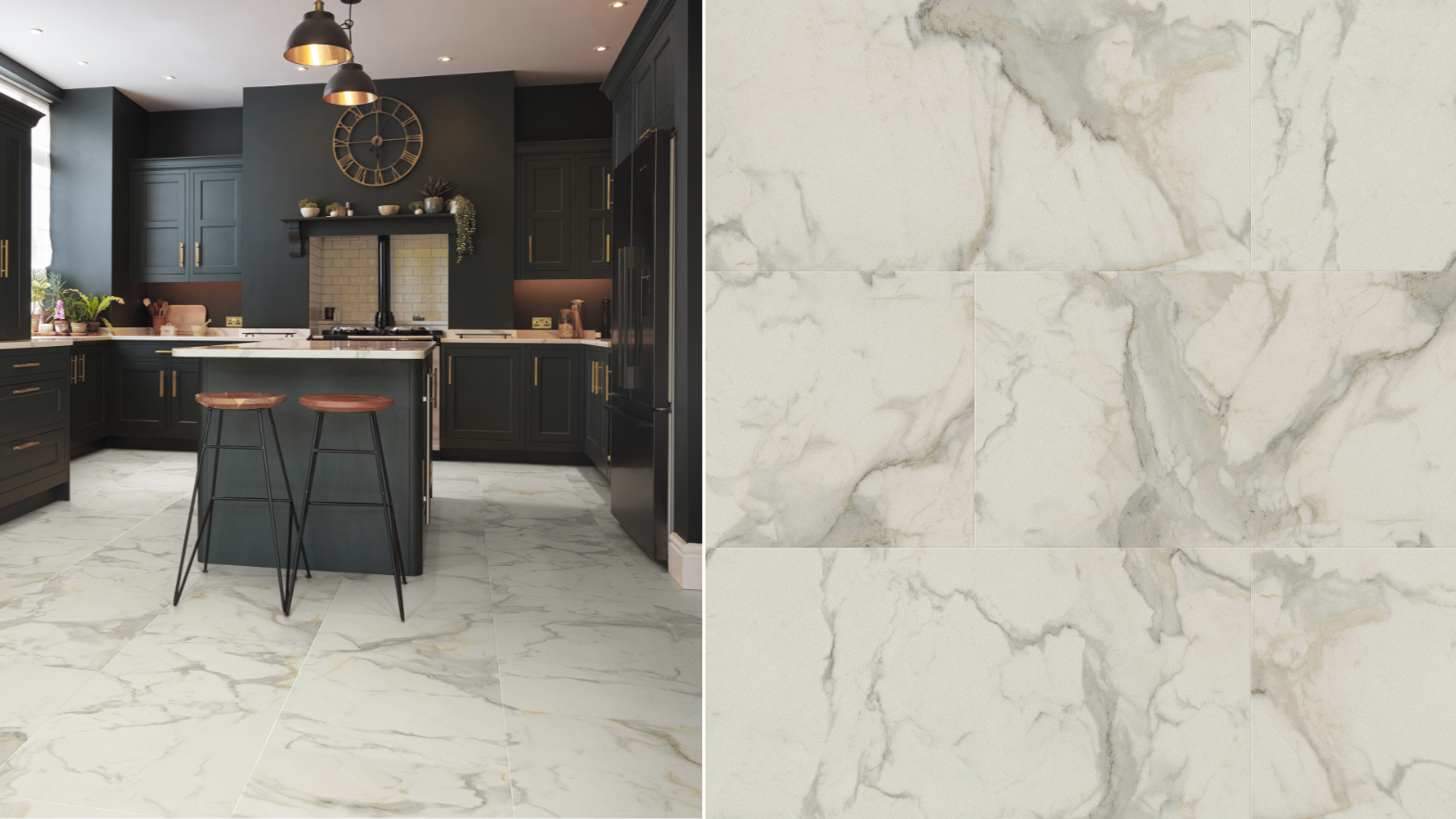 Pair classic painted Shaker units with one of our stunning oak looks, laid as traditional planks, timeless parquet or modern herringbone. Or go bold by teaming deep grey cupboards with marble effects for added drama.
